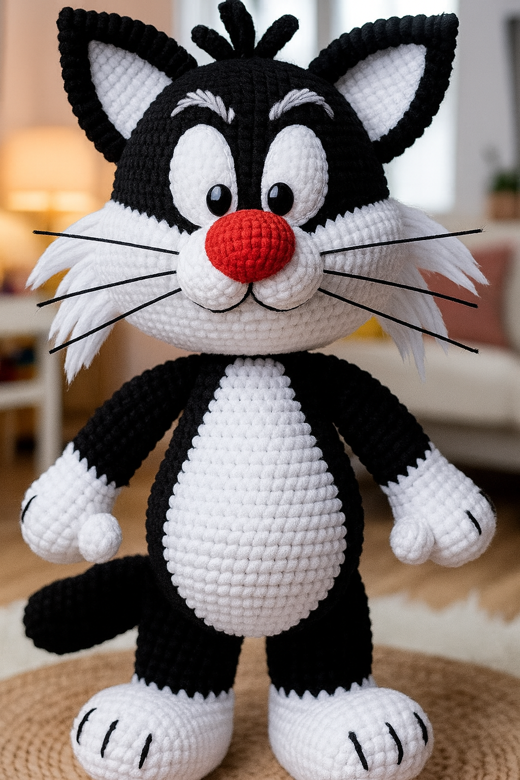 For Sylvester’s face, use red yarn to crochet a small oval for the nose, and stitch it to the center of the white muzzle. Add small white cheeks using felt or crochet circles. Attach safety eyes or embroider oval eyes just above the nose. Use black yarn to add eyebrows and whisker marks for his characteristic expression.