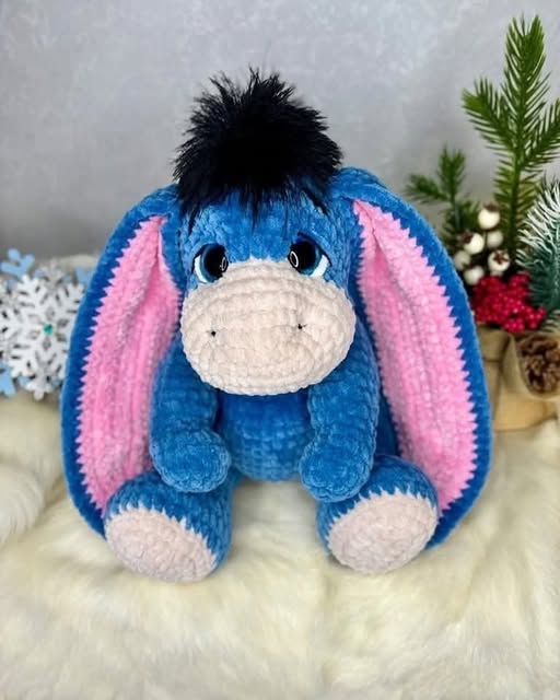 The ears are long and slightly floppy, giving Eeyore his recognizable expression. Crochet two identical pieces in gray, then add a pink inner layer for contrast. Sew the layers together and attach them symmetrically to the head.