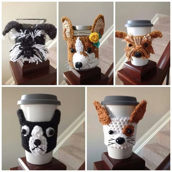 On the other hand, dog mug cozies can represent various breeds—from a floppy-eared beagle to a curly-haired poodle. These cozies often use neutral colors like brown, tan, or black and can include a buttoned snout or felt nose for added charm.