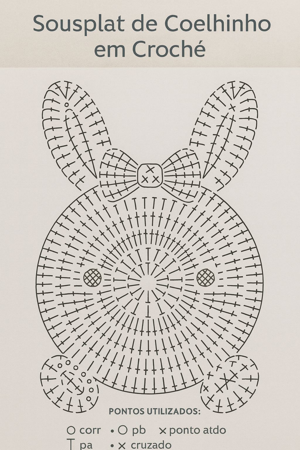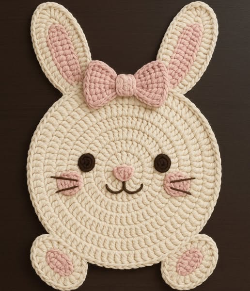 The most charming part of this project is the bunny motif. You can crochet the bunny separately using a smaller hook and lightweight yarn, then sew or attach it to the center or edge of the sousplat. The bunny’s shape can vary — some designs feature a side profile, while others show a cute bunny face or silhouette. Add finishing details like eyes, a small nose, and a fluffy tail for personality.